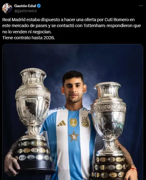 Según la información de Gastón Edul, Real Madrid ya se contactó con el combinado londinense y recibió una respuesta contundente. Los Spurs no lo quieren negociar. Romero tiene contrato vigente con el club del Top 6 de la Premier League hasta julio del 2026.